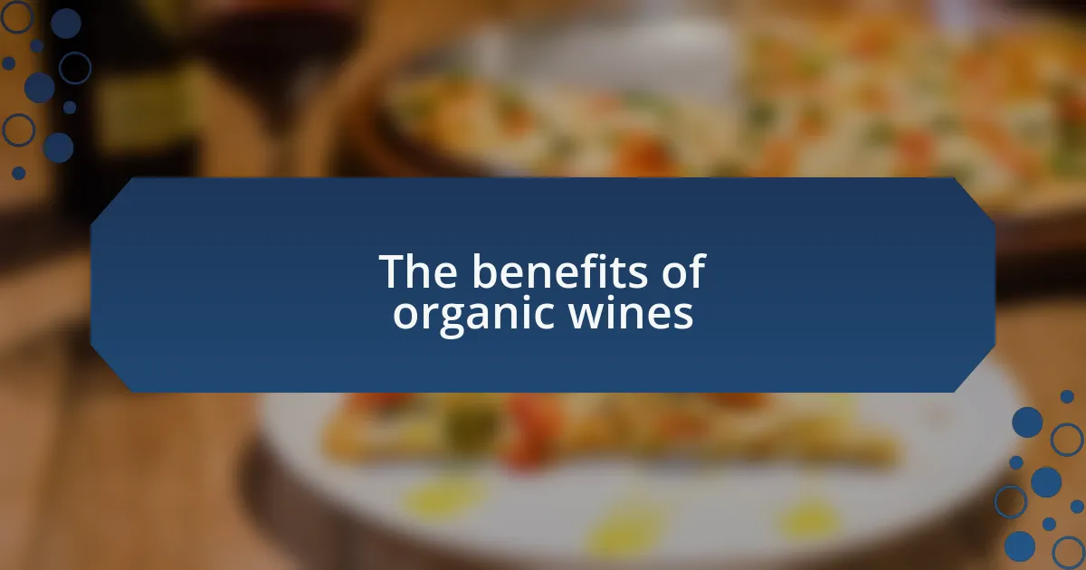 Organic wines offer a plethora of benefits that resonate with both the environment and our health. Personally, I’ve always found that wines made from organic grapes tend to have a purer taste, allowing the unique terroir to shine through. It’s as if every sip tells the story of the land, free from chemical pesticides and artificial additives. Have you ever noticed how some wines just feel cleaner on the palate? That’s often the result of organic practices.