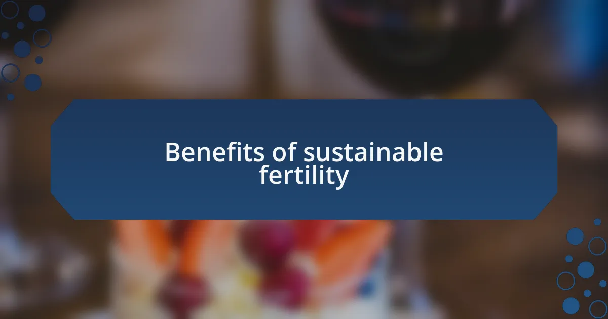 Sustainable fertility offers remarkable benefits, particularly in maintaining soil health. I remember visiting a small vineyard where the winemaker shared their struggles with soil degradation. By implementing composting and natural amendments, they not only rejuvenated their soil but also witnessed a remarkable return of beneficial microorganisms. Have you ever considered how healthy soil can translate into healthier vines?