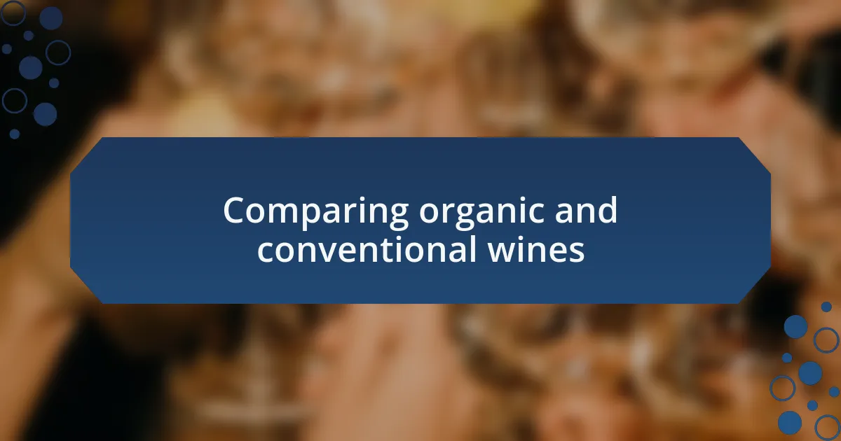 When comparing organic and conventional wines, one key difference lies in the farming practices used. Organic wineries often prioritize sustainability, avoiding synthetic pesticides and fertilizers, which can lead to a more balanced ecosystem in the vineyard. I remember visiting an organic vineyard where the air felt different—cleaner, more alive. It made me think about how these practices not only affect the environment but also the final product we enjoy in our glasses.